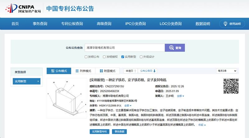 近日,湘潭华联电机有限公司自主研发的“一种定子铁芯、定子铁芯组、定子及其电机”技术,成功获得国家知识产权局授权,专利号为CN223729513U。此项专利于2025年1月正式提出申请,2025年12月26日授权公告,标志着公司在电机核心零部件设计领域取得了新的突破。